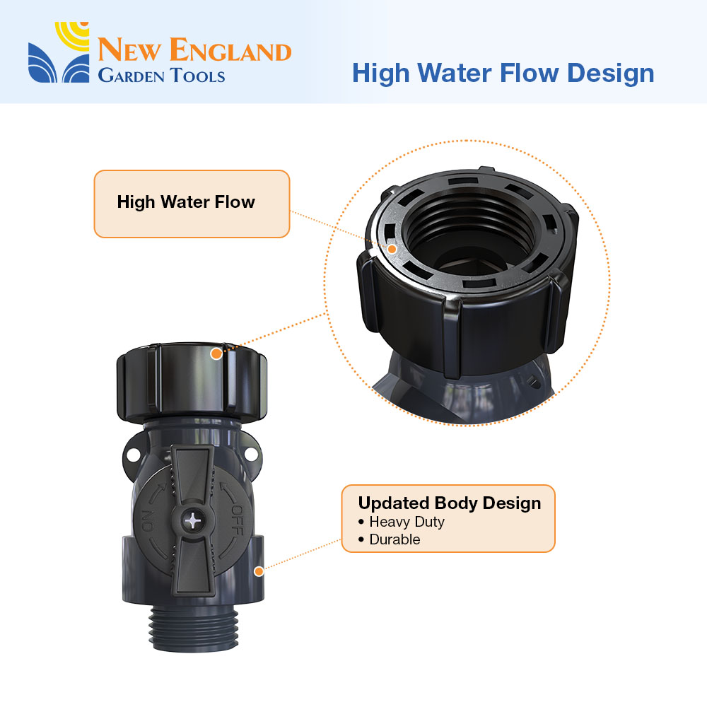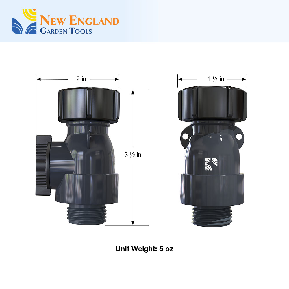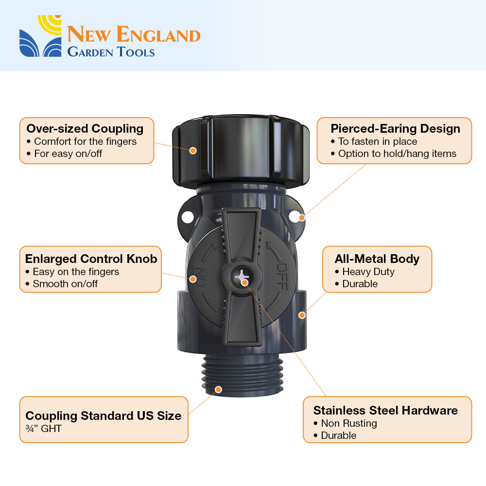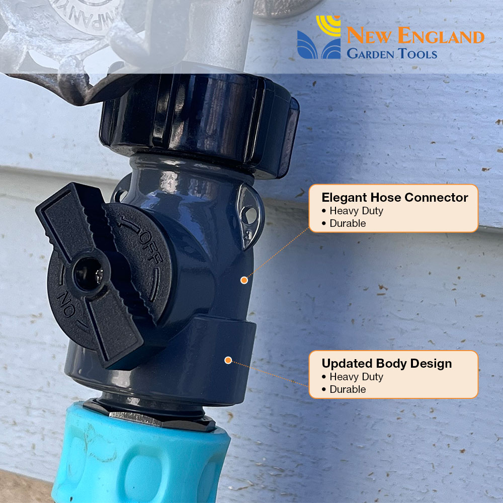 Our new all-metal 1-way Connector with a Shut off Valve helps you manage your water needs around the hose, in the shop, around your yard, and on the job. It has an easy grip coupling and an oversize flange for easy on/off function. It can be used to attach 2 hoses or connect to a wall faucet. You can keep the valve open or reduce the water flow and pressure by partially closing the valve. Our 1-way hose connector is robust yet easy to handle and move around. The all metal body allows for years of service. So whether you are watering your front yard, your backyard or any other space, you can count on your 900001 to be up to the job! The New England Garden Tools company designs products to be functionally practical, sturdy, and uses quality materials for durability. We take pride in our tradition and quality workmanship.
