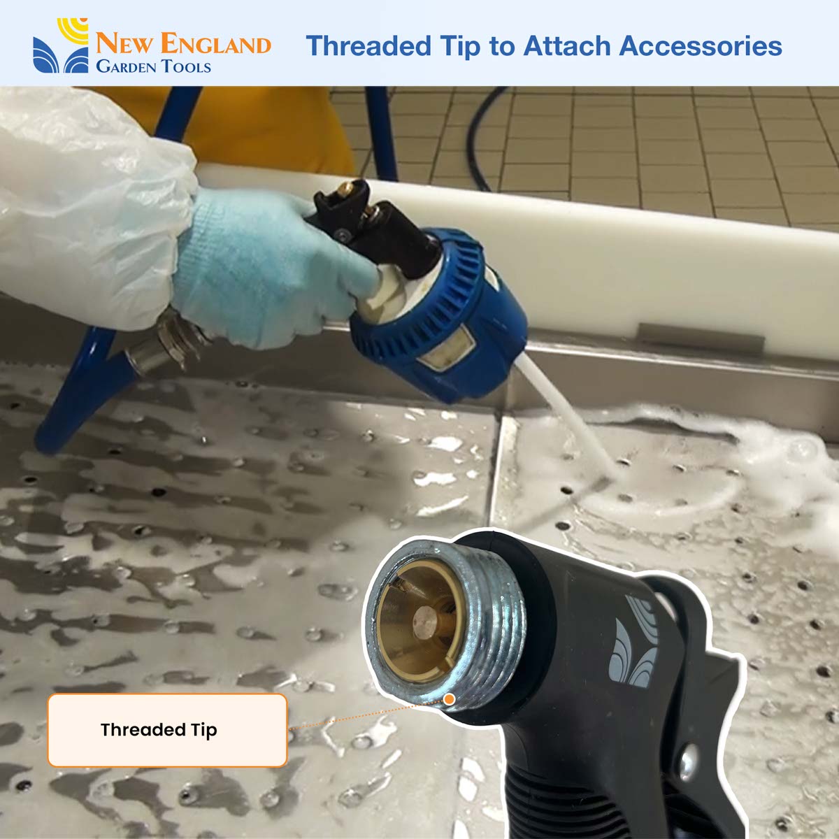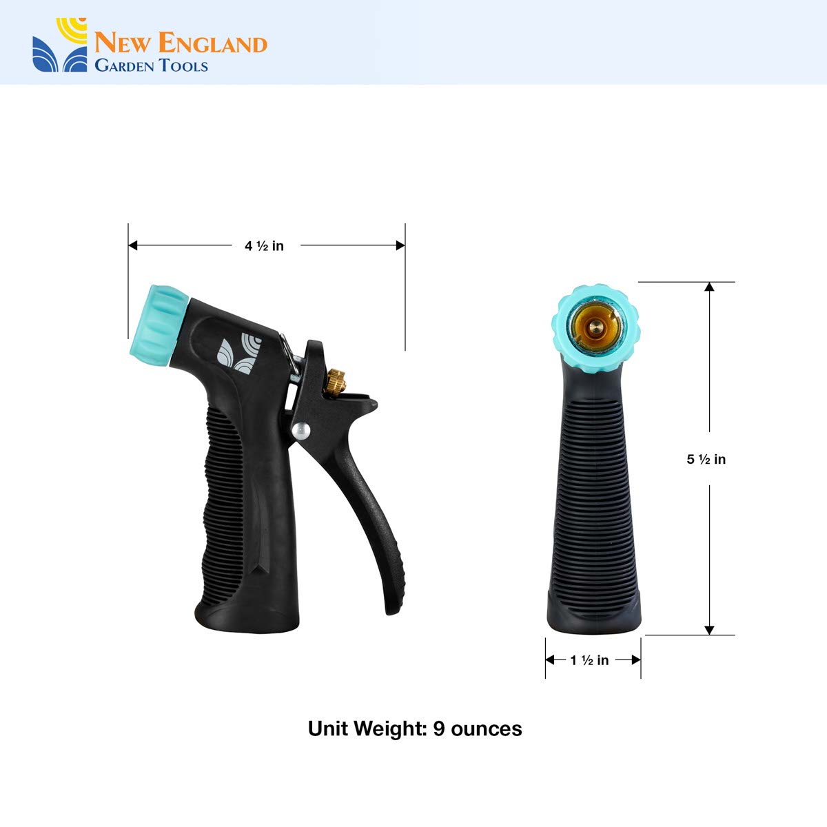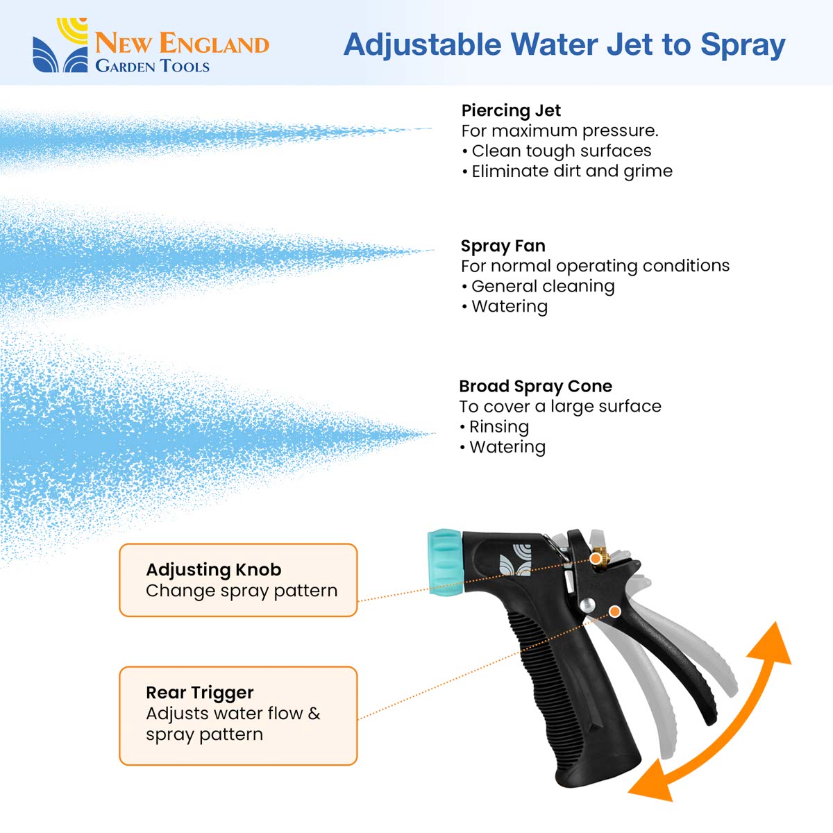 Our all-purpose adjustable water jet nozzle is designed for cleaning with hot water. We have built the nozzle with a rear trigger for ease-of-use. Rear trigger reduces the strain on your fingers. With a sturdy all-metal core, the handle is covered with insulating rubber to allow operation at different temperatures. It will give you a powerful jet or a gentle fan-like spray to adapt to the job. Just connect it to your hose and you are ready to clean a kitchen, clean a worksite, or spray a driveway. The nozzle can also operate to adopt to many other tasks. So whether you are cleaning your driveway, watering your garden, working in your tool shed, washing your car, working in the shop, getting ready for a barbeque with neighbors, you can count on your new 500012 nozzle to be up to the job! The New England Garden Tools company designs products to be functionally practical and sturdy. Our products are built with quality materials for durability. We take pride in our tradition and quality workmanship.